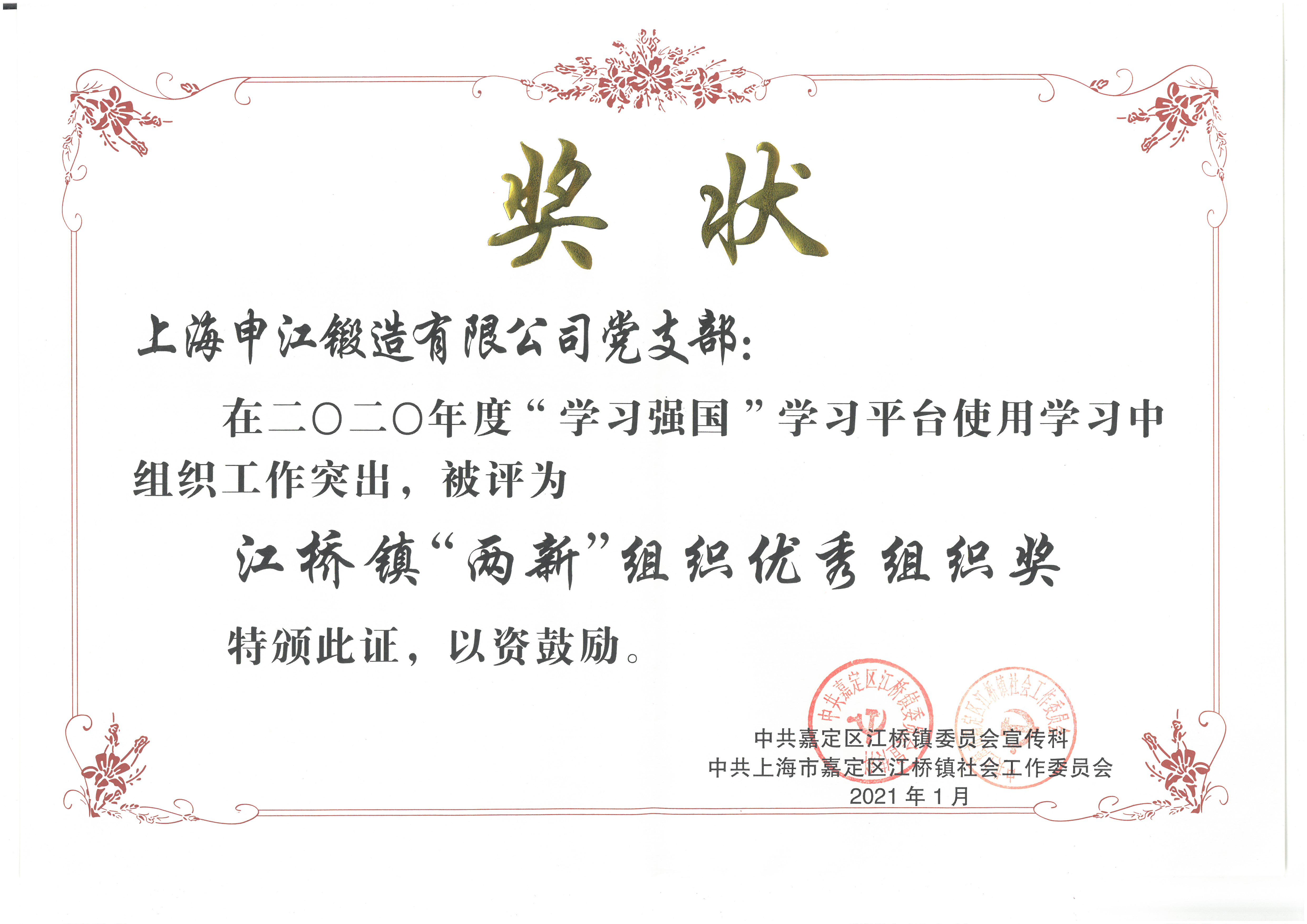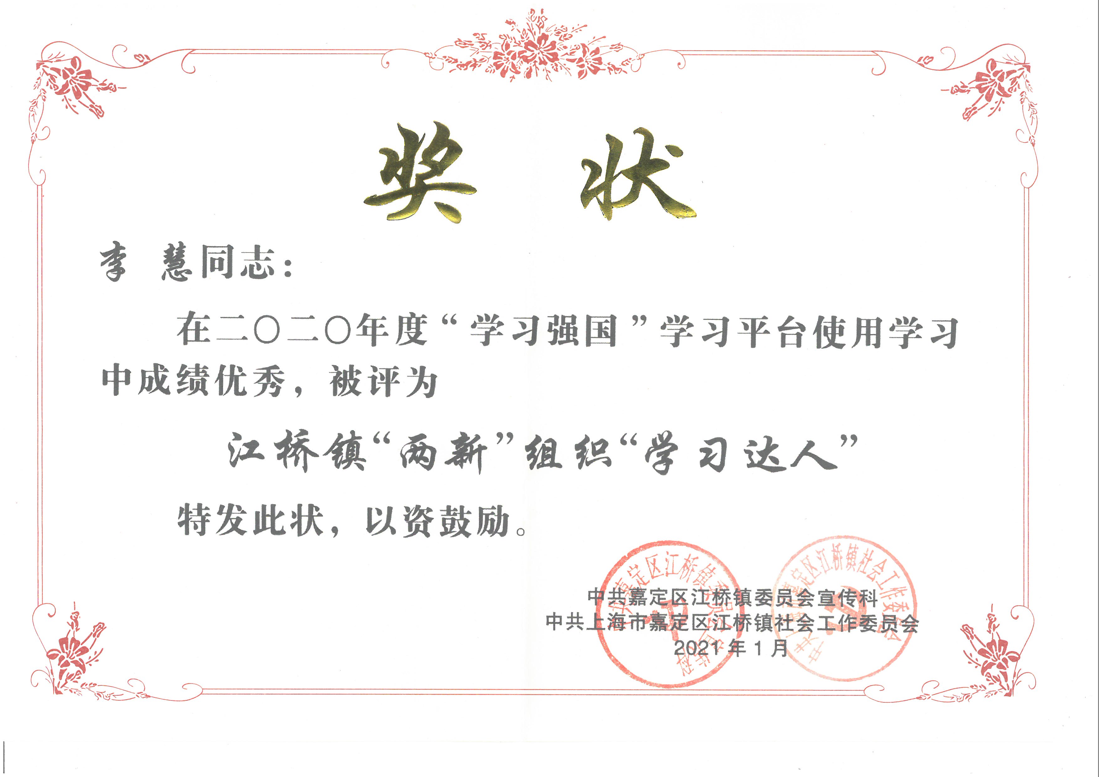 1月21日上午,江桥镇社会工作党委召开了江桥镇“两新”组织“学习强国”学习分享会,会上表彰了一批2020年江桥镇“两新”组织“学习强国”的先进个人及支部,我支部陈全明及李慧分别获得2020年度“学习达人”荣誉,我支部因“学习强国”平均分达1万以上,获评2020年度优秀组织奖。
