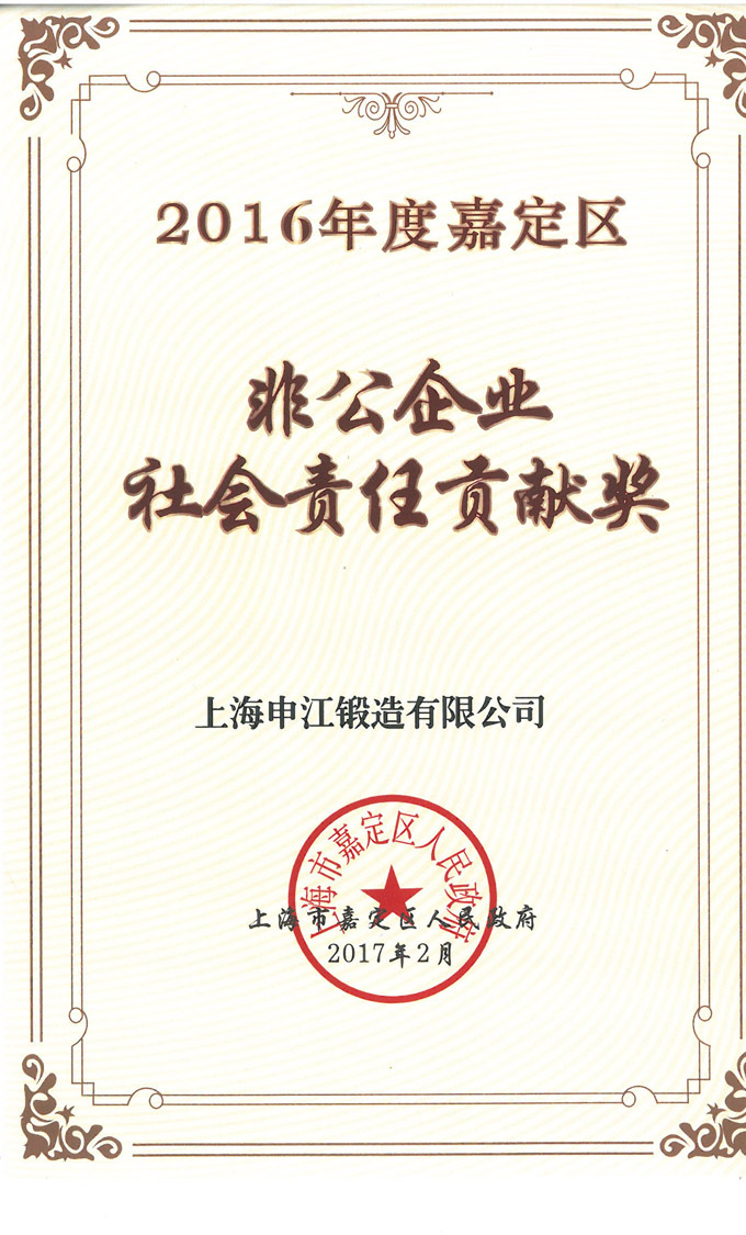 上海申江锻造有限公司荣获“2016年度嘉定区非公企业社会责任贡献奖”