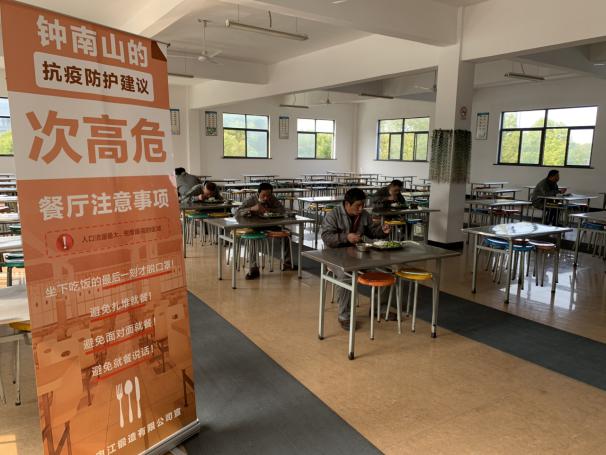 五、食堂分时就餐安排到位。将中午就餐时间段延长,严格按照一人一桌的方式,分批就餐,并安排专人值守维持排队领餐秩序,确保队伍中人与人之间间隔1米。